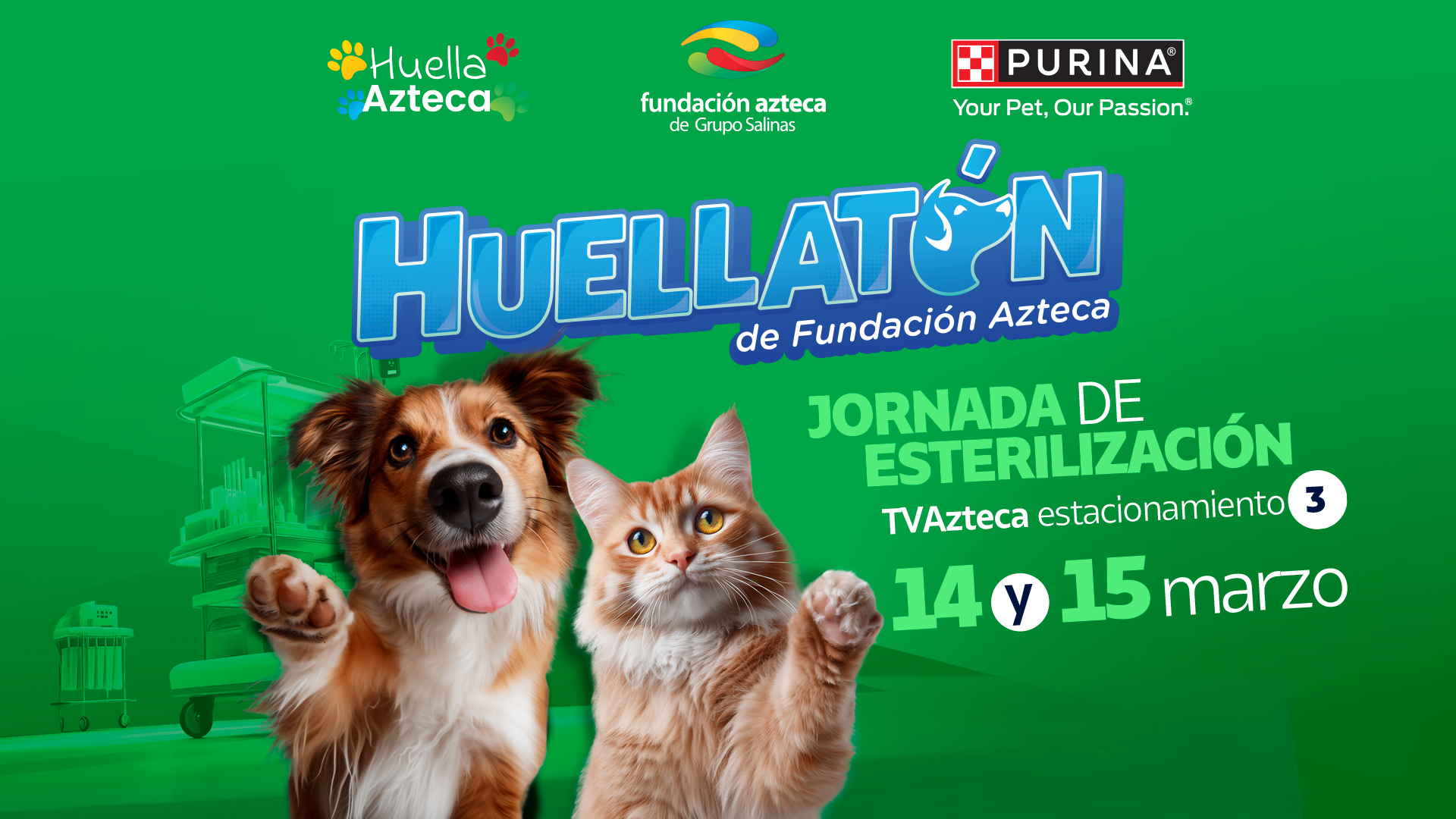 En el marco del “Día Mundial de la Esterilización Animal” Fundación Azteca de Grupo Salinas y Purina® unimos fuerzas para realizar una mega jornada de esterilización para perros y gatos a la que podrán acceder el público en general, los albergues y protectores independientes previo registro en los medios indicados en las bases de esta convocatoria.